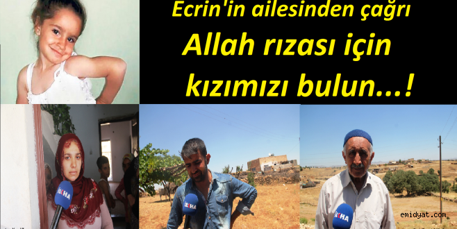 Evlat acısıyla gözyaşları içinde konuşan Ecrinin babası Bekir Tunç, “Tüm Türkiye’ye sesleniyorum, kızımı gören veya alan Allah rızası için getirsinler. Ne isterlerse vermeye hazırız. Allah rızası için kızımı bulun.” dedi.