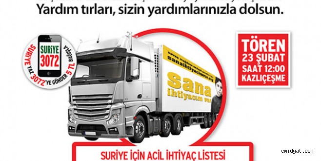 Bu tablo karşısında, bölgede yardıma muhtaç insanlar için bir çok yardım kampanyası düzenleyen İHH İnsani Yardım Vakfı, şimdiye dek gerçekleştirmiş olduğu en büyük TIR organizasyonunu yapmaya hazırlanıyor. Bugüne kadar Suriye`ye 2 bin 100 yardım TIR`ı gönderen İHH, 1 Ocak-28 Şubat arasında göndermeyi hedeflediği 500 TIR`ın 200`ünü 23 Şubat Pazar günü Türkiye genelinde düzenlenecek programlarla kaldıracak.
