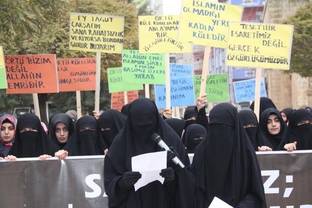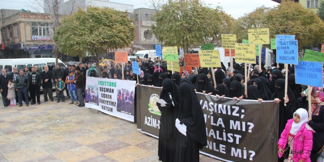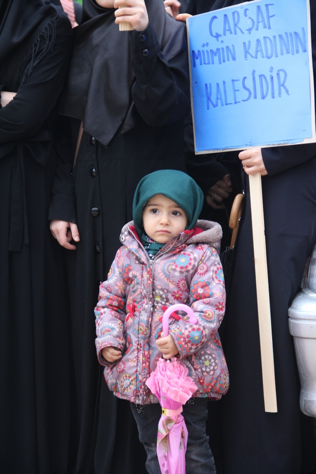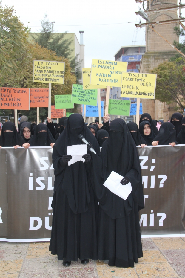 Yapılan basın açıklaması için toplanan ve çoğunluğunu bayanların oluşturduğu grup ellerinde, ‘’Örtü köleliğin değil özgürlüğün sembolüdür’’, ‘’Tesettüre saldırmak ancak bir akıl tutulmasıdır’, ‘’Örtü bizim değil Allah’ın emridir’’, ‘’ Tesettüre uzanan diller kurusun’’, ‘’Çarşaflıyız köle değil özgürüz’’, ‘’Tesettüre uzanan eller kırılsın’’, ‘’Çarşaf mümin kadının kalesidir’’, ‘’İslam’ın olmadığı yerde kadın köledir’’, ‘’İffet Müslüman kadının erdemidir’’, yazılı dövizler taşıdı.