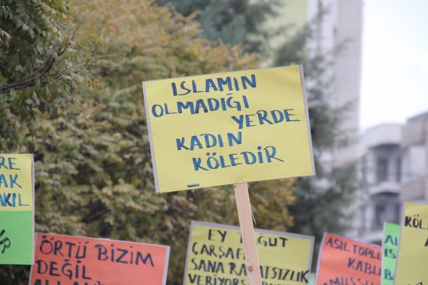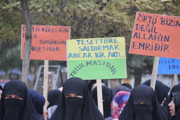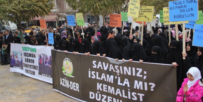 Basın açıklamasında, “Tesettüre uzanan eller kırılsın, Tesettüre uzanan diller kurusun” şeklinde sloganlar atıldı.