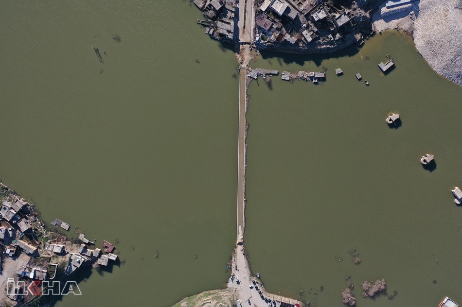 Hasankeyf’in son durumunu drone ile çeken İlke Haber Ajansının paylaştığı görüntülerde, antik kentin önemli bir kısmının sularda kaybolduğu, birçok tarihi mekânın sular altında kaldığı belirgin şekilde görülüyor.