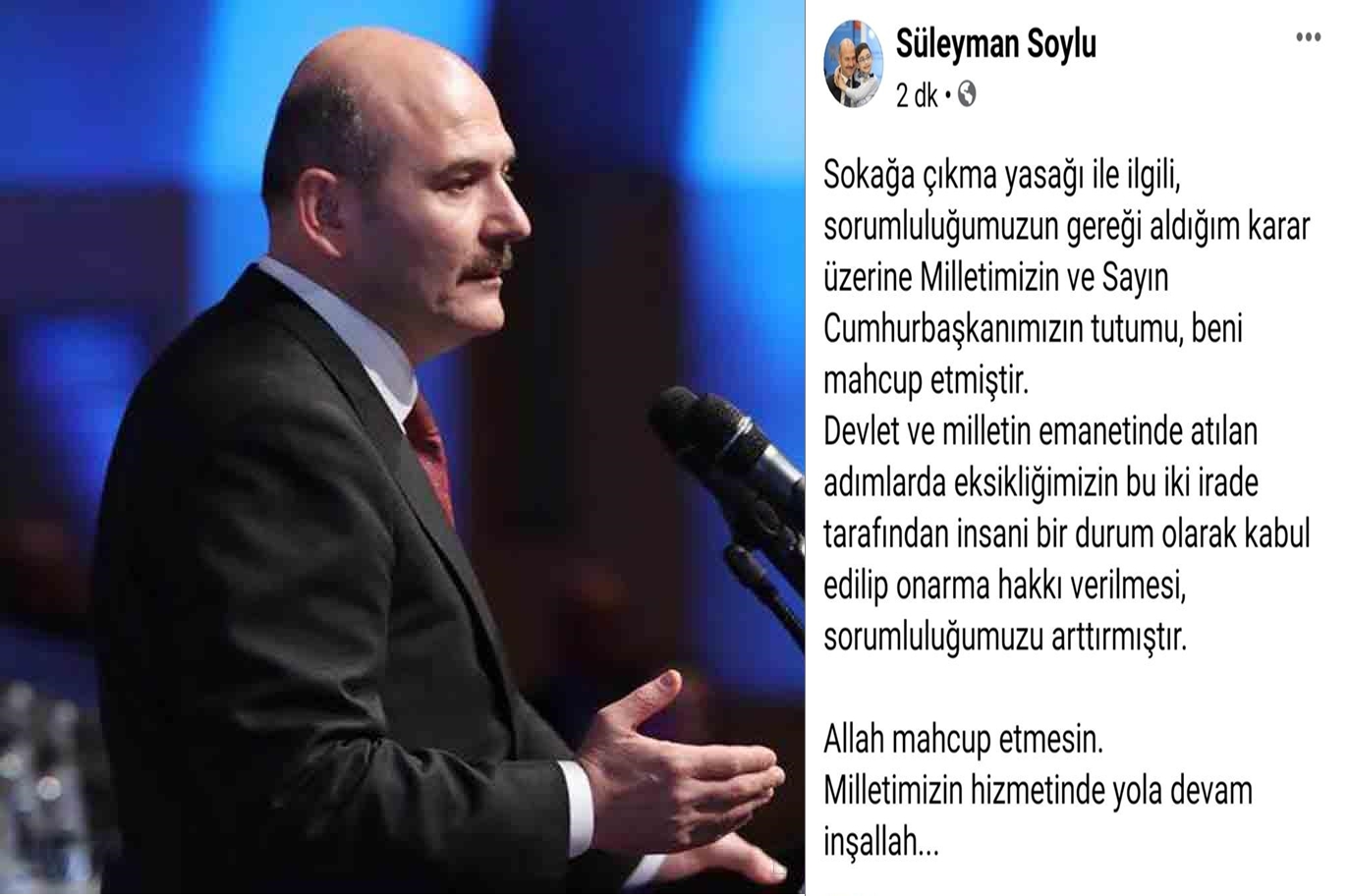 Bakan Soylu, bugün yaptığı yeni açıklamada, "Sokağa çıkma yasağı ile ilgili, sorumluluğumuzun gereği aldığım karar üzerine Milletimizin ve Sayın Cumhurbaşkanımızın tutumu, beni mahcup etmiştir. Devlet ve milletin emanetinde atılan adımlarda eksikliğimizin bu iki irade tarafından insani bir durum olarak kabul edilip onarma hakkı verilmesi, sorumluluğumuzu arttırmıştır. Allah mahcup etmesin. Milletimizin hizmetinde yola devam inşallah..." dedi. (İLKHA)