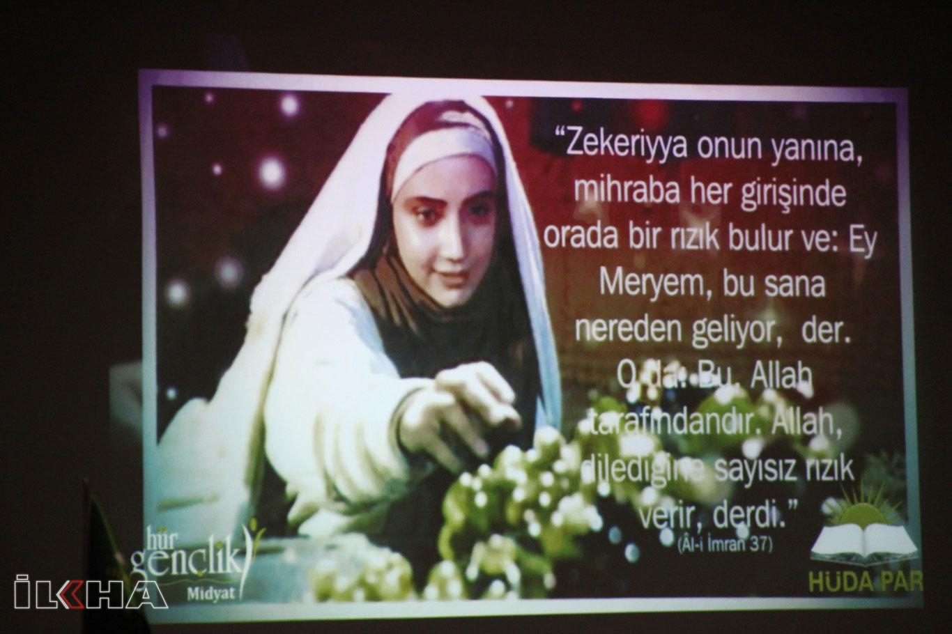 Kocatepe Okulu konferans salonunda hÜda par Midyat Gençlik Kolları Başkanlığı (Hür Gençlik) tarafından yılbaşı kutlamalarına dikkati çekmek amacıyla düzenlenen "Hazreti Meryem'in iffeti ve Hazreti İsa'nın mesajı" konulu programda bir konuşma yapan İTTİHADUL ULEMA Üyesi Eğitimci Remzi Uçar, Hazreti Meryem gibi iffetli evlatlar yetiştirmek için öncelikle ebeveynlerin Kur'an çizgisinde bir aile hayatı yaşamaları ve salih bir kişilik ortaya koymaları gerektiğini söyledi.