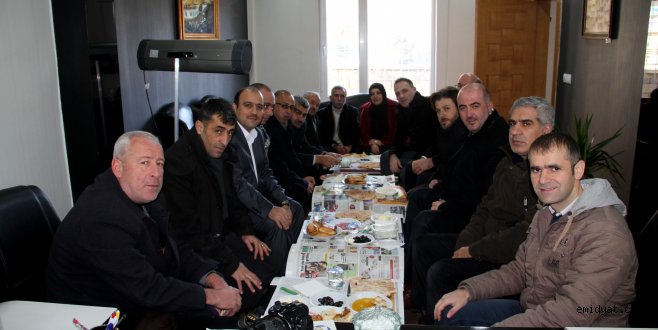 MİDYAT HABERLERİ- Kahvaltıya Ak Parti İlçe Başkanı Bekir Melih Güneştan, Ak Parti İlçe Teşkilatı Tanıtım ve Medya Başkanı Mehmet Sait Turgut, yönetim kurulu üyeleri ve ilçede görev yapan gazeteciler katıldı.Kahvaltıdan sonra kısa bir açıklama yapan Ak Parti İlçe Teşkilatı Tanıtım ve Medya Başkanı Mehmet Sait Turgut, zor şartlarda görev yapan gazeteciler başta olmak üzere, çalışan tüm gazetecilerin 10 Ocak Çalışan Gazeteciler Günü’nü kutladıklarını söyledi. Gazetecilerin zor şartlarda çalışan bir meslek grubu olduğunu belirten Turgut, “ Değerli basın mensubu arkadaşlarımıza ufak bir jest olsun münasebetiyle 10 Ocak Cumartesi günü parti binamızda basın mensubu arkadaşlarımız için hazırladığımız kahvaltıya icabet ettiğiniz için teşekkür ederiz. 10 Ocak Çalışan Gazeteciler gününüzü Kutlarım.” dedi. Midyat’ta görev yapan gazeteciler adına konuşan gazeteci Selahattin Erol ise 10 Ocak Çalışan Gazeteciler Günü’nde kendilerini unutmayan Ak Parti ilçe teşkilatına ve ilçe yöneticilerine teşekkür etti. Yapılan kahvaltı ve konuşmaların ardından hatıra fotoğrafı çekildi.