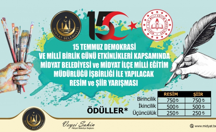 Midyat Belediyesinden yapılan açıklamada, "İlçemizdeki İlkokul, Ortaokul ve Lise düzeyinde eğitim gören ve ilçede ikamet eden öğrencilerimize 15 Temmuz Demokrasi ve Millî Birlik Günü etkinlikleri kapsamında günün anlam ve önemini belirten resim ve şiir yarışması düzenlenecektir. Çocuklarımızın sanatla vakitlerini verimli değerlendirmesini sağlayacağımız etkinliğimize tüm öğrencilerimiz davetlidir. Denildi.