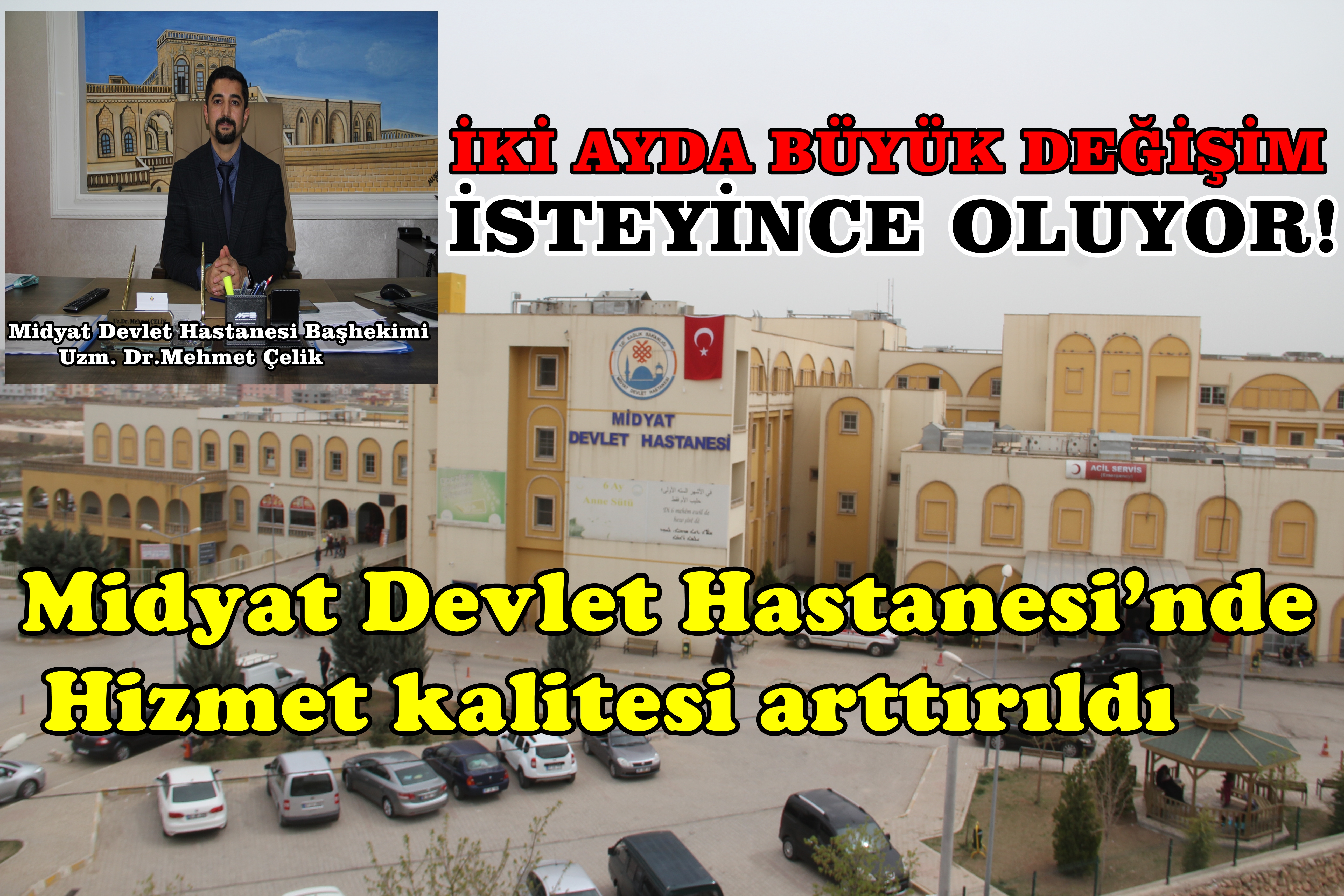 İki ay önce göreve gelen Midyat Devlet Hastanesi Başhekimi Uzm. Dr. Mehmet Çelik; İl Sağlık Müdürü Uzm. Dr Saffet Yavuz Midyat Belediye Başkanı Veysi Şahin ve İlçe Sağlık Müdürü Dr. Sertaç Çelebi’nin büyük destekleri, hastane yönetim kadrosu, hekimleri ve çalışan personellerinin özverili çalışmaları sonucu birçok sorunu sonlandırıp, hizmet kalitesini arttırdıklarını belirtti.