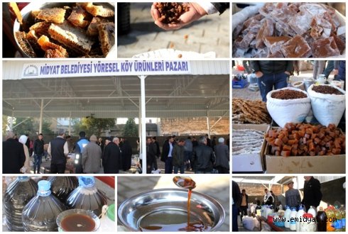 Yaz mevsimi sonunda bağbozumu üzümlerinden elde edilen genellikle kış mevsimlerinde tüketilen kuru üzüm, pekmez, sucuk çeşitleri, kesme, pestil gibi yerli kış ürünleri ve doğal yöresel köy ürünleri, Midyat’ın yöresel köy ürünleri pazarı ile kuruyemişçi esnafın tezgâhlarındaki yerlerini aldı. Tamamı yerli olan bu ürünler Midyat ve köylerinde yetiştirilen üzümden elde ediliyor ve halkın vazgeçilmezleri arasında yer alıyor.İlçenin Yunus Emre Mahallesi'ndeki Midyat Yöresel Köy Ürünleri Pazarı'na sabah erken saatlerde minibüslerle getirilen ürünler, vatandaşlar tarafından yoğun ilgi görüyor.Pazarda bunların dışında kuru incir, sumak, nohut leblebi, yerli fıstık, tarhana, yoğurt kurusu, bal kabağı, şurtan, peynir, süt, bal, dolmalık biber ile patlıcan, turşu, badem, menengiç, kedide, köy yumurtası, canlı tavuk, kavun ve karpuz çekirdekleri de halkın rağbet ettiği ürünler arasında. Pazarda birçok yöresel ürün yaşlı kadınlar tarafından satışa sunuluyor.Köy ürünleri satıcısı Muhammed Nurullah Çelik, köylülerden aldıkları yöresel ürünlerinin Midyat ve yurtiçinde tanıtım ve satışını yaptıklarını söyledi.Çelik, "Midyat’ın yöresel ürünlerini satıyoruz. Alışverişini yapıyoruz. Köylüden alıp toptan olarak Diyarbakır ve Kızıltepe gibi yerlerde esnafa satıyoruz. Kuru üzüm, pekmez, cevizli sucuk, pestil gibi ürünleri organik olarak alıp tanıtımını da yapıp satıyoruz. Midyat yöresel köy ürünleri pazarı güzel olmuş, belediyemize teşekkür ediyoruz. En azından köylülerimizin ürünlerini satabilecekleri kapalı güzel bir yer oldu. Pazarda pekmez, pestil, sucuk gibi birçok ürün bulunuyor. Özellikle kuru üzüm çeşitlerimiz çoktur. Midyat’ın farklı mahallelerinden farklı üzüm çeşitleri var." şeklinde konuştu.Yöresel ürünler almak için pazara gelen Hasan Çelebi ise yeni yapılan yöresel köy ürünleri pazar yerinin güzel bir çalışma olduğunu, ancak yetersiz kaldığını ifade ederek şunları söyledi: