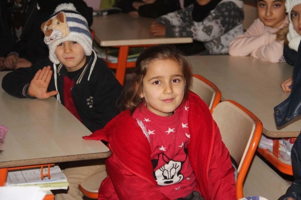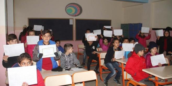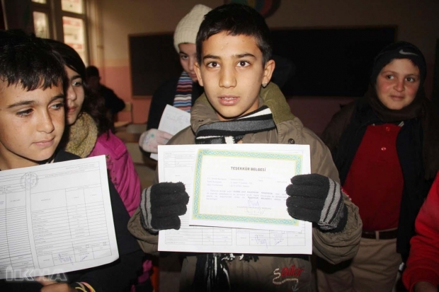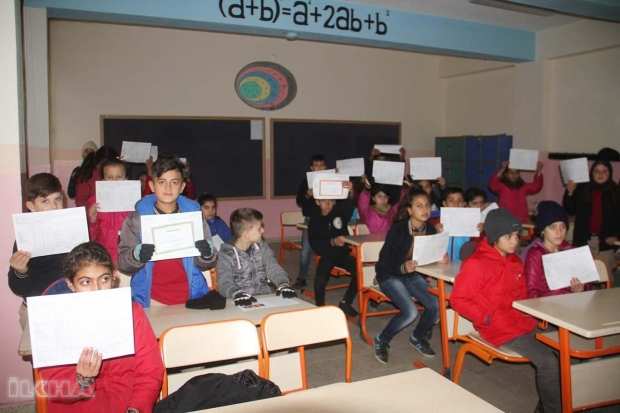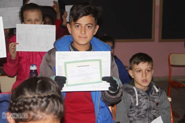 Suriyeli sığınmacıların çocuklarının da okul okuduğu Kocatepe İlk ve Ortaokulunda sabah saat 9.00 itibariyle karneler verilmeye başlandı.