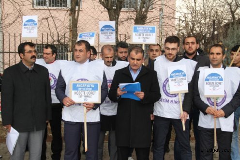 Midyat Eğitim Bir-Sen Basın Sözcüsü Mehmet Aslan’ın yaptığı açıklamada, karşılıksız nöbet görevine ve ek ders esaslarındaki adaletsizliğe karşı toplandıklarını söyledi. Aslan kamu kurumlarında yapılan her nöbet görevinin bir karşılığı bulunduğunu belirterek, “Milli Eğitim Bakanlığı’na bağlı eğitim kurumlarında nöbet görevinin bir karşılığının olmamasının izah edilecek bir tarafı yoktur. Angaryaya hayır diyor, nöbet görevi için ücret istiyoruz.” ifadelerinde bulundu.