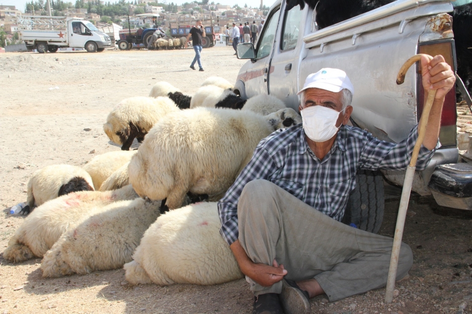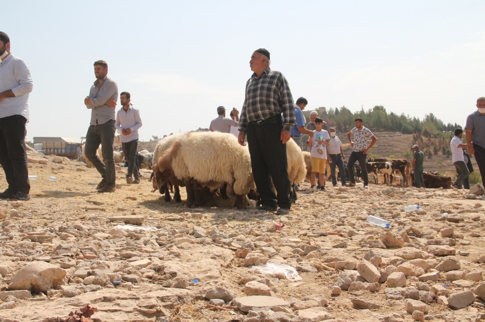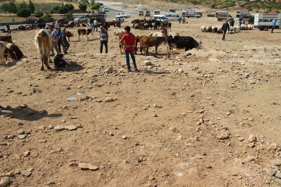 Sıcak havaya rağmen pazara gelmek zorunda kalan hayvan satıcıları sıcaktan korunmak için arabaların gölgeliklerine sığınmaya çalışırken, hayvanların ise güneşin altında öylece durmak zorunda kaldıkları görüldü.