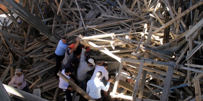 Kazım Karabekir Caddesi’nde inşaatı devam eden caminin kubbe iskelesi, sıva yapılırken çöktü. Büyük bir gürültüyle çöken iskelenin üzerinde çalışan 5 sıva ustası iskelenin altında kaldı. Olayı görenlerin yardımıyla iskele altından çıkarılan Ahmet Irmak (40), Hasan Beyaz (49), Murat Irmak (34), Enver Irmak (18) ve M.Sait Dursun (34) adlı işçilere olay yerine gelen 112 Acil sağlık ekipleri tarafından ilk müdahale yapıldı. Ambulanslarla Midyat Devlet Hastanesine kaldırılan işçilerin tedavileri devam ediyor.
