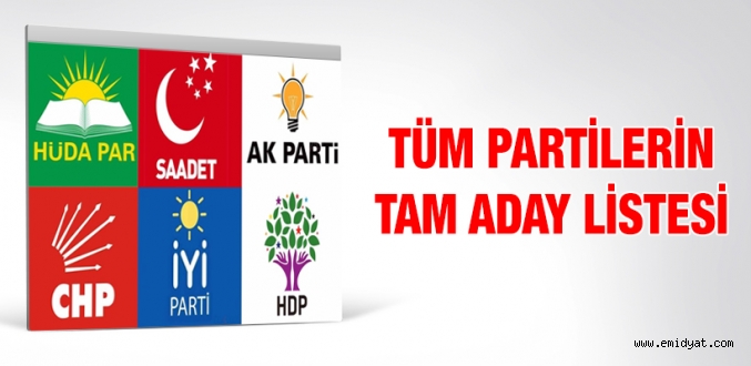 HÜDA PAR Aday Listesi(http://ilkha.com/files/arsiv/FILE-20180521-1651FYG5E9SQ67MU.pdf)Ak Parti Aday Listesi ( http://ilkha.com/files/arsiv/FILE-20180521-1615QKVUNX61AB6Q.pdf)CHP Aday Listesi (http://ilkha.com/files/arsiv/FILE-20180521-1618CD4854D3YDPP.pdf)İYİ Parti Aday Listesi (http://ilkha.com/files/arsiv/FILE-20180521-1706L5MRCMJ83LRJ.pdf)HDP Aday Listesi (http://ilkha.com/files/arsiv/FILE-20180521-2035KFE1KYWLBL9G.pdf)SP Aday Listesi (http://ilkha.com/files/arsiv/FILE-20180521-1749HPCBE44XC5F3.pdf)MHP Aday Listesi (http://ilkha.com/files/arsiv/FILE-20180522-0037MQ5SAG2VGL27.pdf)