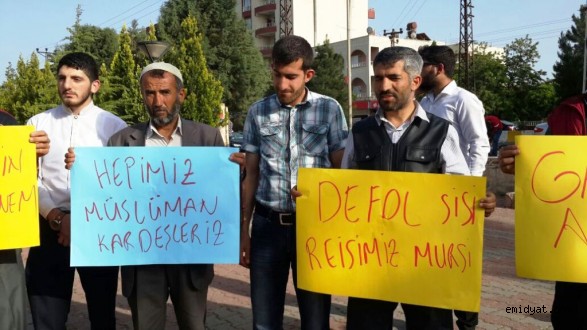 “Defol Sisi reisimiz Mursi”, “Mursi yalnız değildir”, “Asrın Hubeyb’i Mursi’ye selam”, “Susma idamlara dur de” gibi çeşitli dövizlerin açıldığı basın açıklaması, “Zalimler için yaşasın Cehennem “ sloganıyla sona erdi.