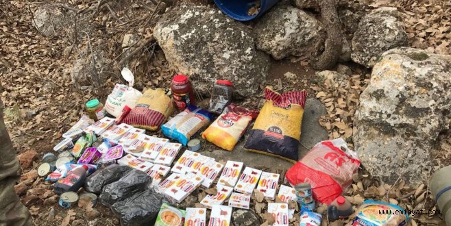 “Bu sırada toprağa gömülü vaziyette, 20 kilogram makarna, 10 kilogram un, 5 kilogram turşu, 10 kilogram salça, 5 kilogram zeytin, 5 kilogram pekmez, 40 paket küp şeker, 20 kutu ton balığı ve benzer gıda malzemeleri ele geçirilmiştir.”