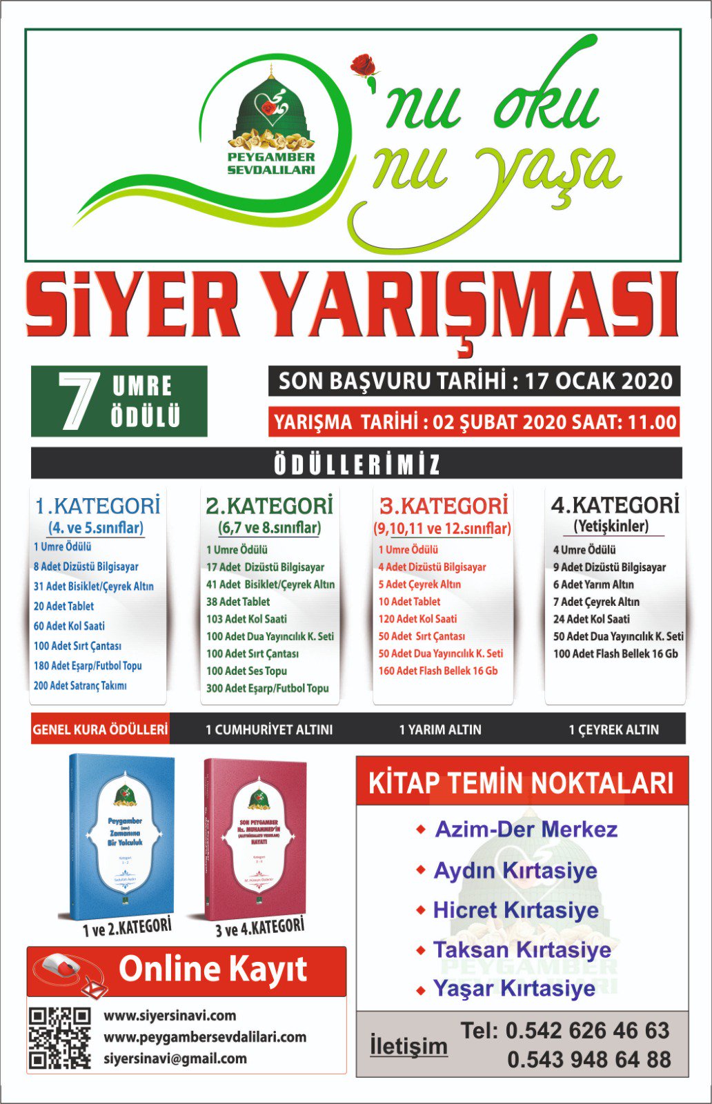 Peygamber Sevdalıları Vakfı tarafından düzenlenen ve her yıl yüz binlerce kişinin katıldığı Umre ödüllü 2020 Siyer Yarışması kayıt başvuruları başladı .Başvuru ve kayıtlarda bir yeniliğe gidildi. 4 kategoride düzenlenecek yarışmada 1.kategori ((4.ve 5.Sınıflar) ile 2. Kategori ( 6.7.ve 8.sınıflar) için bir kitap, 3.kategori (9,10,11,ve 12.sınflar) ve 4.kategori (Yetişkinler) ise bir kitaptan sorumlu olacaklar.Kitap temin noktalarından alınacak kitapların üzerindeki filigran barkod kazılarak çıkan kodun http://www.siyersinavi.com/ adresindeki başvuru kayıt formunda ilgili yerlere gerekli bilgilerin girilmesi ile başvuru yapılabilir. Son Başvuru Tarihi : 17 Ocak 2020Yarışma Tarihi : 2 Şubat 2020 Pazar günü Saat: 11.00Ödül listesi ve kitap temin noktaları ve iletişim bilgileri aşağıdaki fotoğrafta belirtiliyor:
