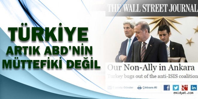 `WSJ editörleri` imzasıyla gazetenin internet sitesinin hem İngilizce hem de Türkçe yayımlanan yazının başlığı da son derece çarpıcı: Ankara artık ABD`nin müttefiki değil.