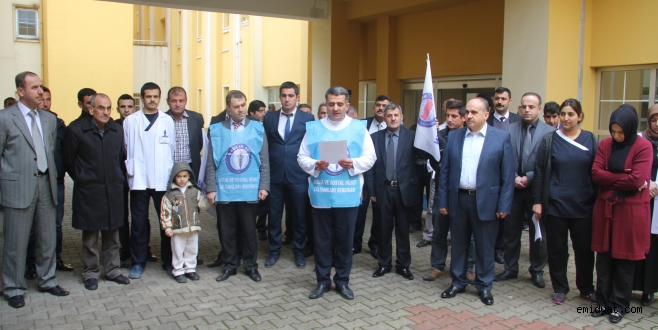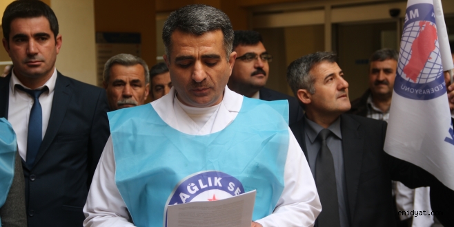 Midyat’ ta Sağlık Sen üyeleri sağlık çalışanlarına yıpranma payı verilmesi, ek ödemelerin emekliliğe yansıtılması ve hastanelere kreşler açılması talebiyle basın açıklaması düzenledi.